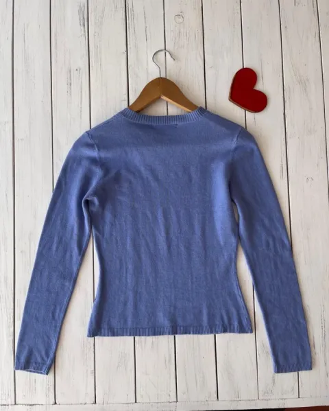 Suéter ajustado azul. Talla: XS y SMedidas: 36 hombros, 38.5 axila y 51.5 largoSuéter azul, se le quitaron las etiquetas, muy suave al tacto, ajustable al cuerpo Lycra, tiene unas pequeñas manchas en las costuras laterales y en las fotos se pueden apreciar.