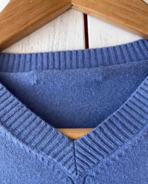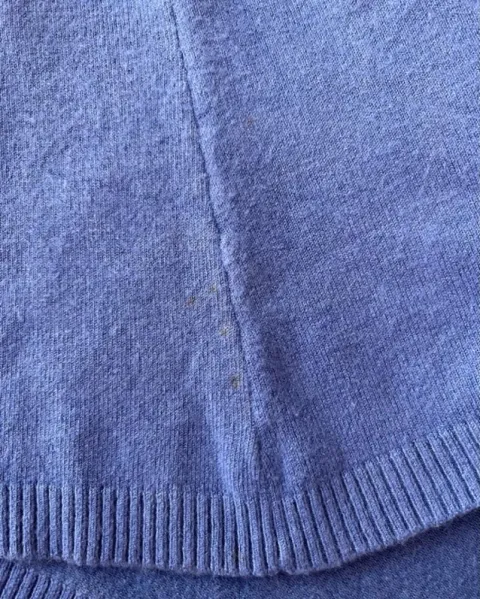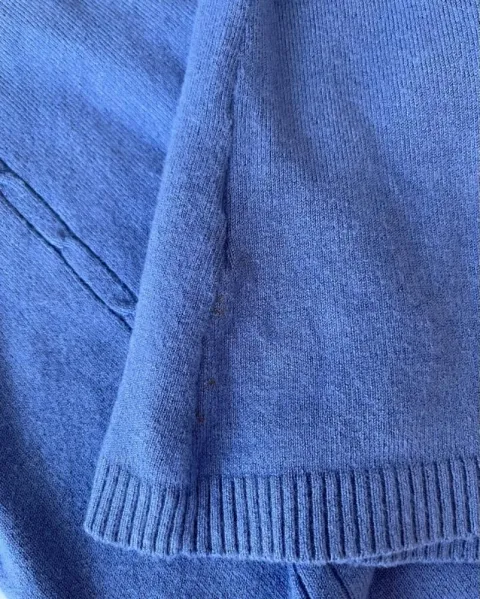 Talla: XS y SMedidas: 36 hombros, 38.5 axila y 51.5 largoSuéter azul, se le quitaron las etiquetas, muy suave al tacto, ajustable al cuerpo Lycra, tiene unas pequeñas manchas en las costuras laterales y en las fotos se pueden apreciar.
