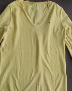 Sueter de la marca tommy, talla s de color amarillo , ideal para la oficina. Solo se uso 2 o 3 veces, tiene unas pequeñas manchas de cloro en la parte de enfrente como se ve en la fotos, pero casi no se ven
