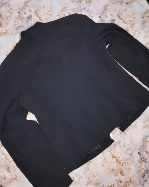 Suéter tipo saco en color negro, solo lleva 2 bolsas a los costados, forro 100% @cetato.Esta echo de Poliester, rayón y licra. Talla6💫Axila x Ax 50💫Cuntura 45💫Largo 55.