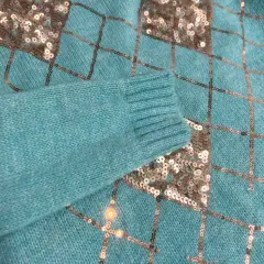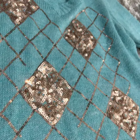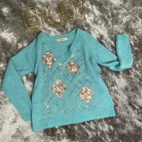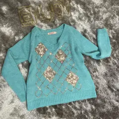 Hermosos sueter en color aqua, cuello en V, calientito, tiene en frente detalles de lentejuelas en color cobre, es XS pero también da una talla S :)