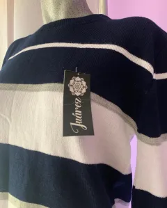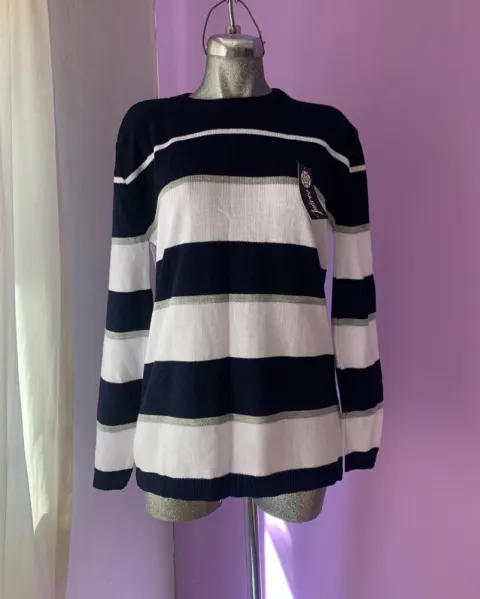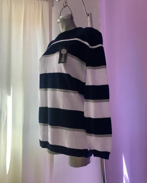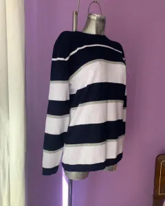 Hermoso suéter de rayas azul con blanco y gris. Es talla grande/extragrande Sus medidas son: 77cm de largo, 51cm de axila a axila y 62cm de manga.
