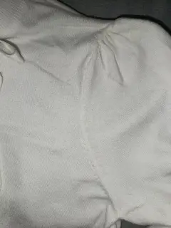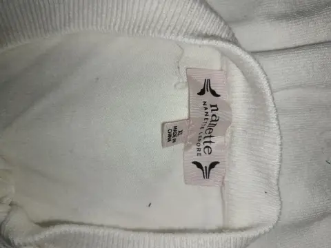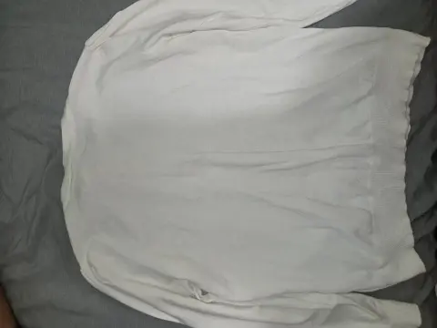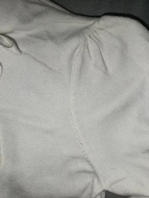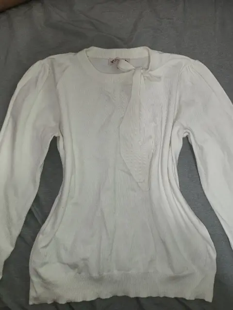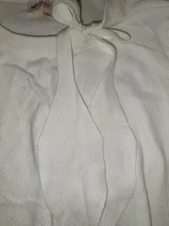 Suéter blanco con moño. Suéter tejido en color blanco con pliegue en los hombros y detalle en las costuras de los brazos, con lazos en el cuello para crear un moño, de cuello redondo, de algodón