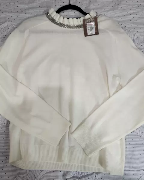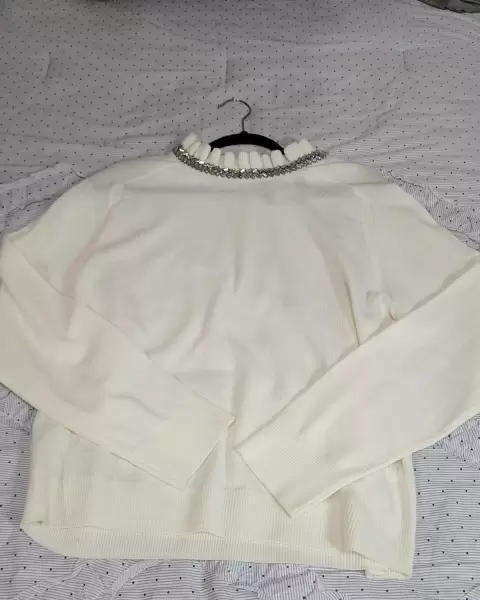 Suéter blanco muy elegante. Suéter blanco muy elegante con cuello plizado y pedrería en elSe abrocha por atrás del cuelloTALLA XGNUEVO CON ETIQUETA DE PALACIO DE HIERRO