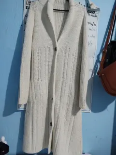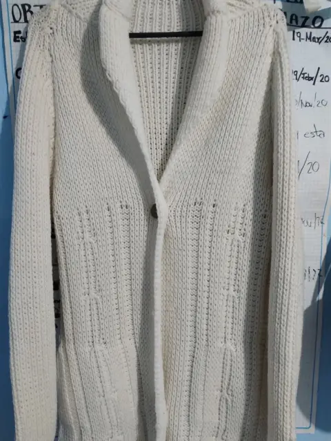 Suéter blanco tejido con bolsa parte frente. Es un artículo con uso pero en excelentes condiciones cuenta con bolsas parte frente llega hasta la rodilla muy cómodo y elegante el detalle falta un botón pero no afecta su uso muy calientito para esta temporada