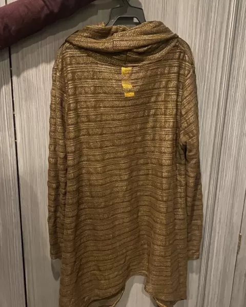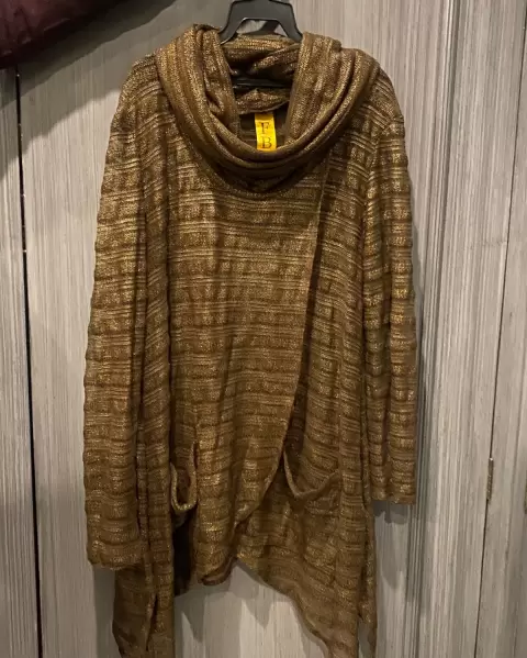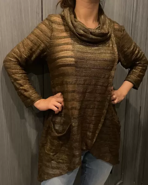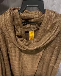 Suéter con transparencia, cuello olgado, bolsas de los dos lados enfrente, apertura en medio, color café brillo, aparenta estar tejido pero realmente no!