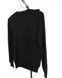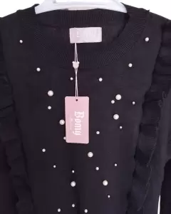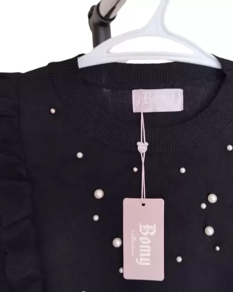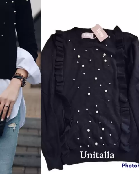 Suéter negro con aplicación de perlas en el frente y escarola en los lados súper lindo muy elegante que no puede faltar en tú outfit