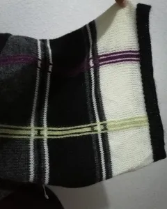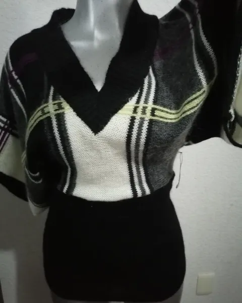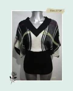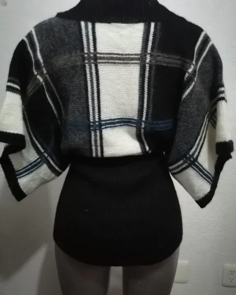Hermosa blusita suéter corte kimono, escote V, de la cintura para abajo es entallada color negro, la parte de arriba es corte kimono con estampado cuadriculado. Medidas largo 73cm, axila a axila 64cm, largo Manga 26.5cm
