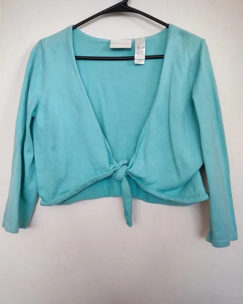 Suéter corto aqua. Descripción:Hermoso suéter tipo torero (corto) color verde agua, en la parte de adelante tiene tiras para justarlo al cuerpo o solo hacerle un nudito y usarlo cerrado o abierto.Talla G pero queda super cómodo a M también