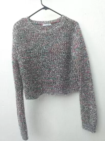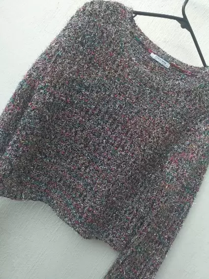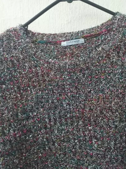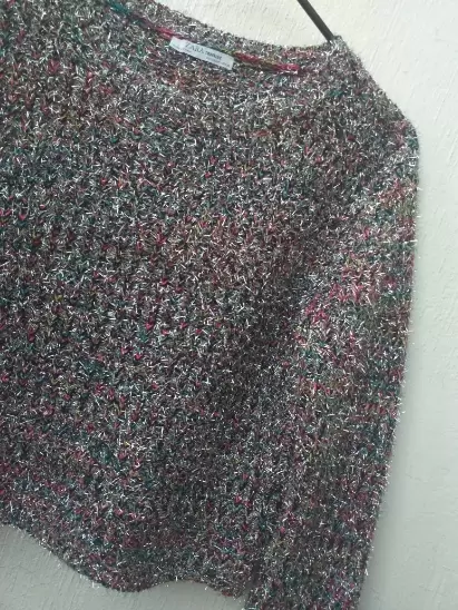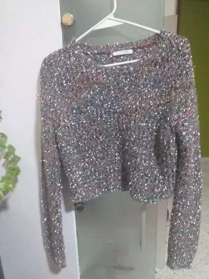 Super original sueter, queda al ombligo, trae hilitos plateados, el tejido es suave, no pica. La talla es mediana. Tiene una solo puesta hermosas, así que esta en perfecto estado.Axila a axila 48 cmsLargo 43 cms