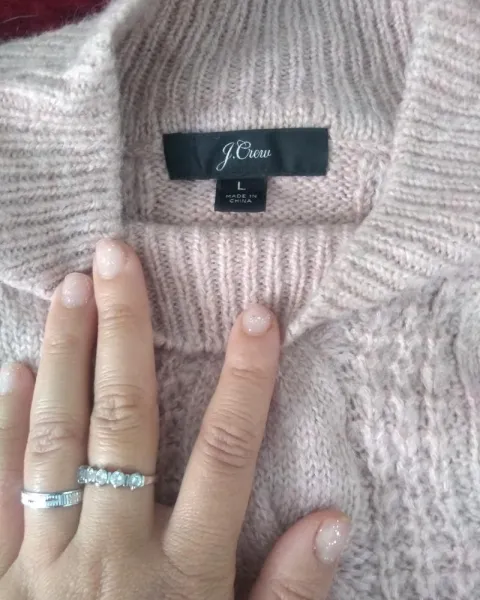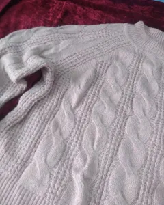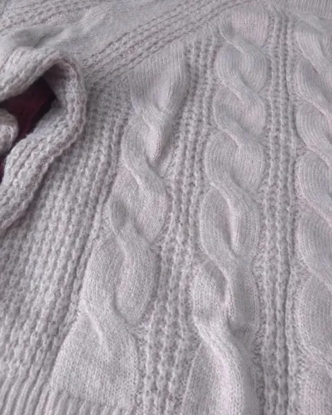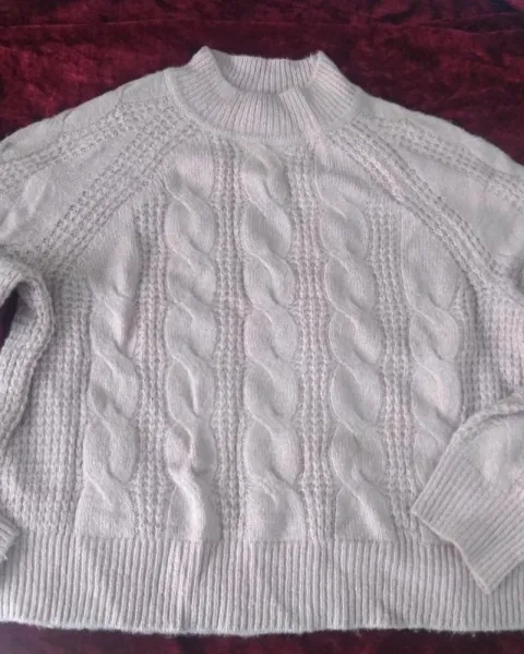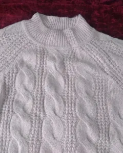 Suéter Cuello redondo color rosa palo, tejido diseño trenza, Estambre delgado y Suave Se utilizó una sola vez. Entrego Limpio y con Aroma a Suavizante.Talla L pero se puede usar como oversize.