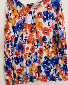 Sueter delgado, con botones, hermoso estampado de flores, predominan el azul y el naranja.