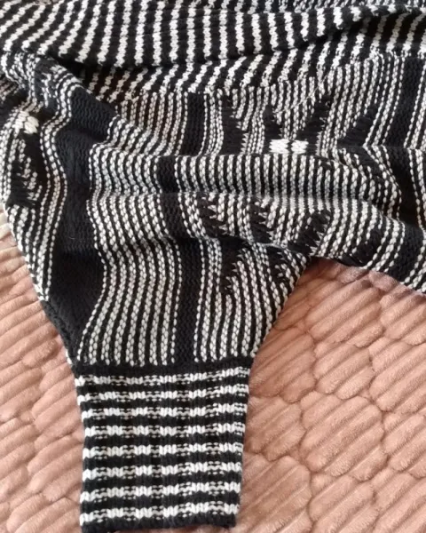 Hermoso suéter, calientito blanco y negro la manga va flojita , llega a, la atura del codo. La talla dice S, pero quedaría hasta una talla L.