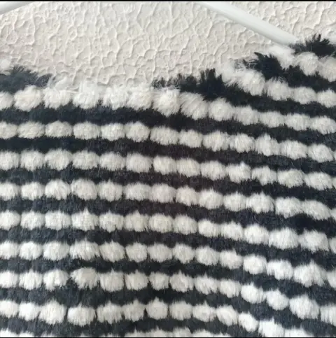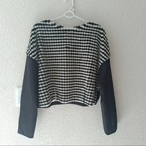 Tiene frente suave a rayas blancas y negras. La espalda es tela lisa color negro. Lo puedes usar con vestido, jeans o mallas. Para usarlo casual o para ir de fiesta.