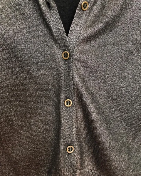 Suéter en V Zaraknit. Este suéter es de la colección Zaraknit de Zara, con tinte plateado es una prenda muy original.