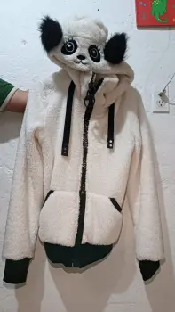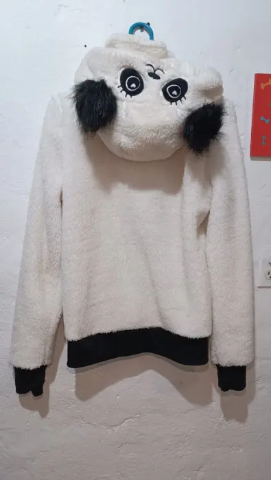 Suéter cómodo, calientito, color blanco con capucha de oso panda, solo fue usado una vez