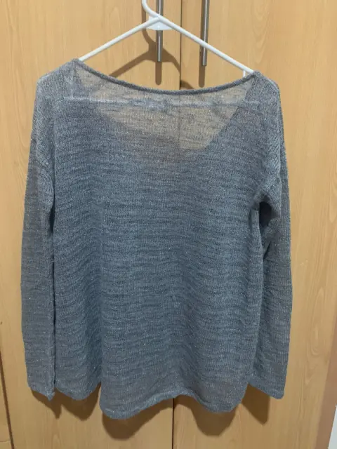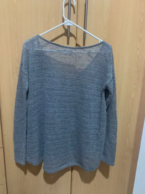 Suéter gris brillante. Este suéter plateado de diseño suelto y medio transparente es la definición de lujo discreto. Su tejido delicado captura la luz, creando un brillo sutil que te hará destacar. Perfecto para combinar con cualquier atuendo, es una prenda versátil que no puede faltar en tu armario.