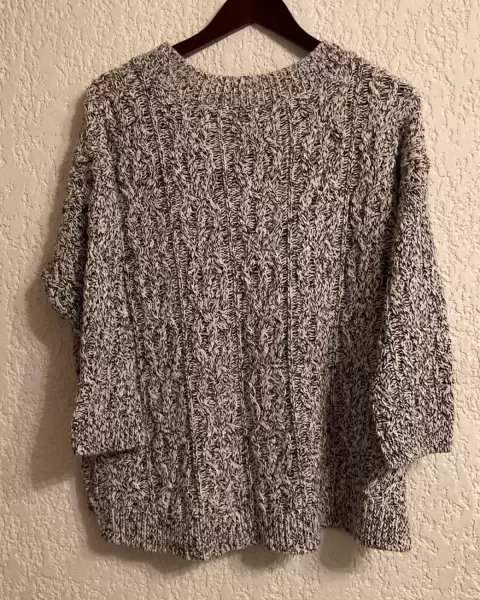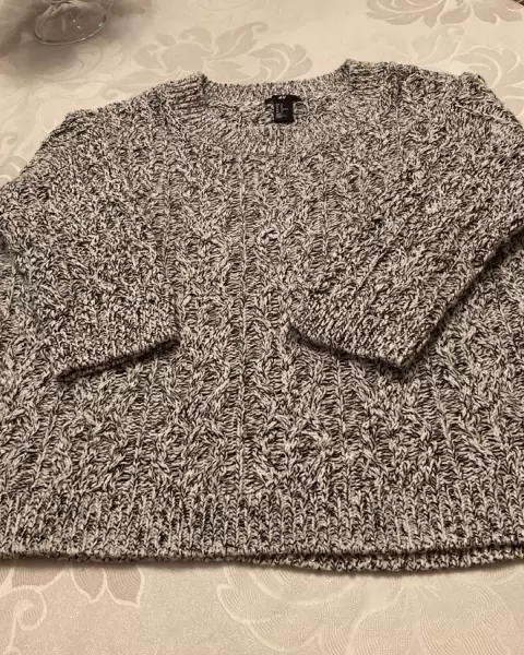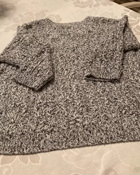 Hermoso y amplio suéter de punto, gris claro con hilos negros, sin detalles.