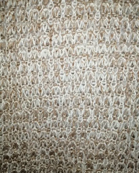 Sueter de punto y hombros descubiertos, decoración de botones de madera, es de un color beige o café muy clarito, dice talla L, pero viene reducido le va bien a Una ch o M
