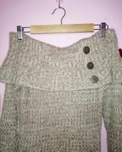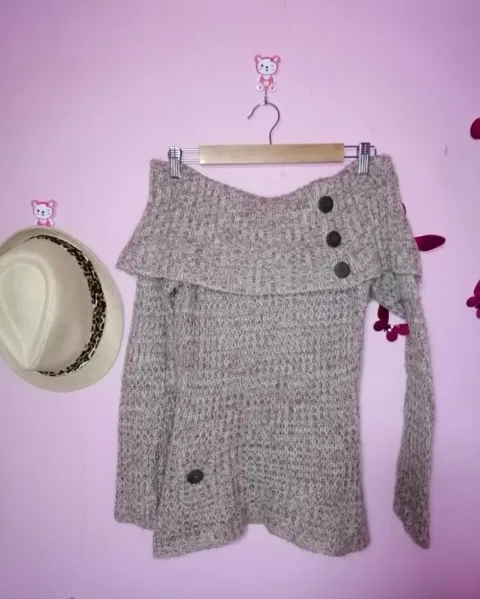 Suéter hombros descubiertos. Sueter de punto y hombros descubiertos, decoración de botones de madera, es de un color beige o café muy clarito, dice talla L, pero viene reducido le va bien a Una ch o M
