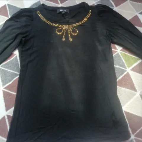 Suéter julio. Hermoso sueter tipo blusa de la marca julio en talla 2, es de tela delgada y ajustable al cuerpo con mangas un poco abombadas y tiene detalles dorados enfrente.En las fotos dejo medidas pero la tela estira aprox 10 cm mas