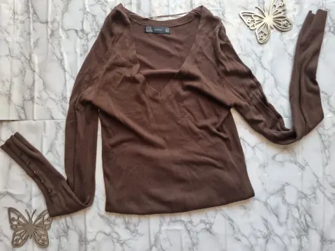 Suéter completo, cuello V,color café, talla S ,marca ZARA.En la manga tiene botones hadas el antebrazo, no es nuevo, tiene algunos detalles.Precio a tratar ,pongo el mínimo de app.