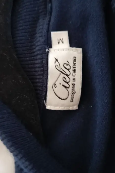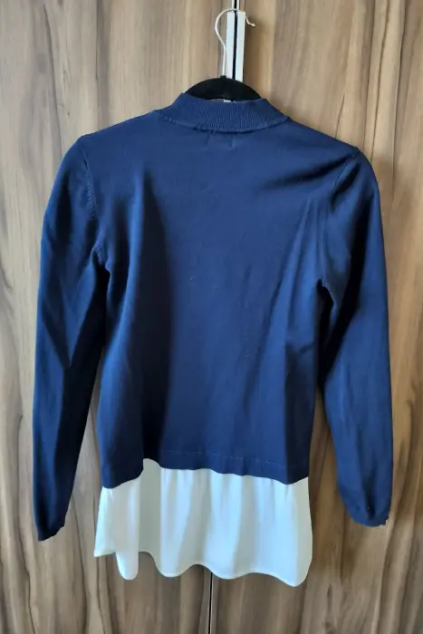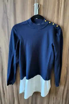 Suéter largo azul marino. Tiene unos lindos botones en el cuello. La parte de abajo es tipo camisa blanca.