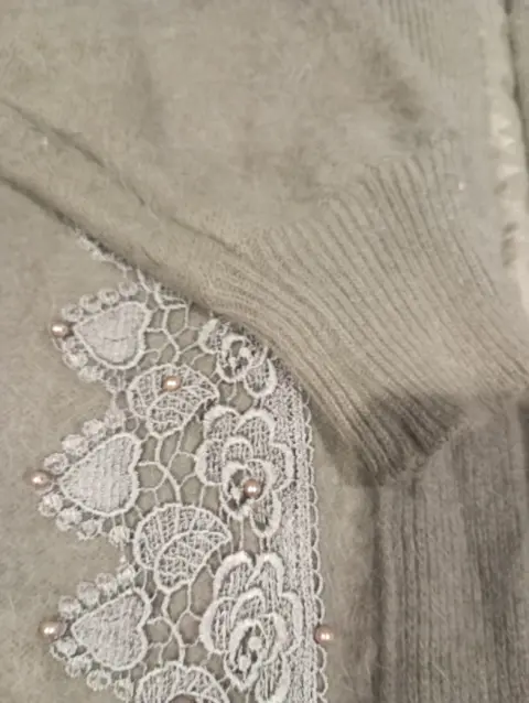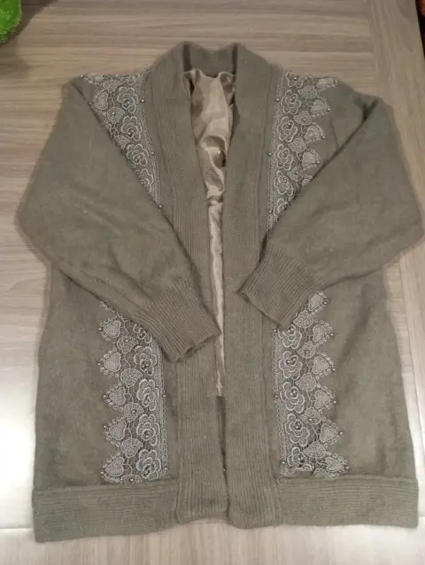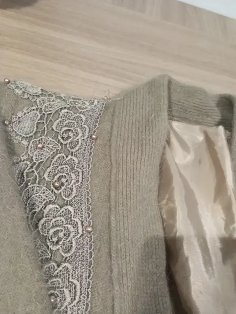 Suéter largo peludo, color café claro con apliques de imitación de perlitas y encaje, cuenta con bolsillos ocultos, hombreras y forro. La etiqueta dice unitalla, pero que a una talla L. Mide 45 cm de hombro a hombro, 58 cm de largo de la manga y 76 cm de largo del hombro hacia abajo. Marca Tae hyun