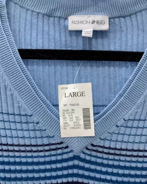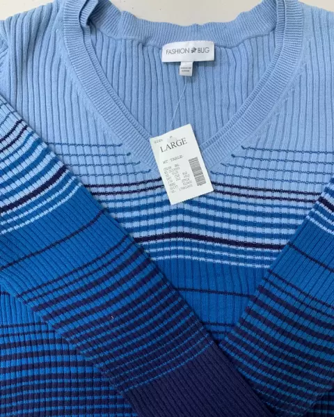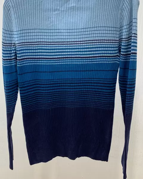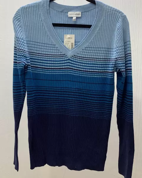 Suéter ligero con cuello V. Suéter ligero con cuello V, diseño con rayas y diferentes tonos de azul
