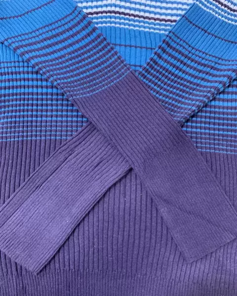 Suéter ligero con cuello V, diseño con rayas y diferentes tonos de azul