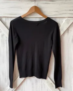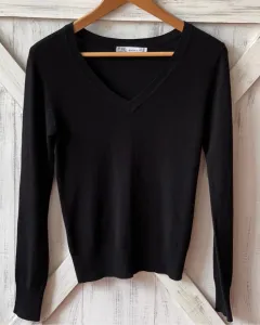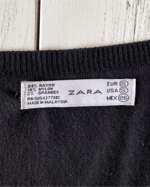 Suéter ligero negro Zara. Talla: S. Medidas: 37 cm de hombros, 38.5 cm de axila y 50.5 cm de largoRayón, nylon y spandex Tiene la etiqueta medio despegada de la esquina superior izquierda