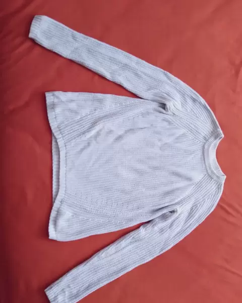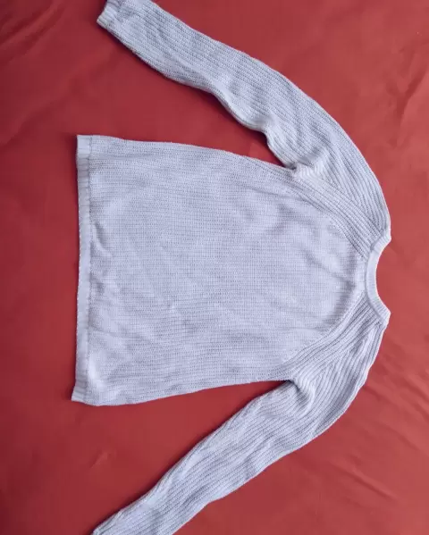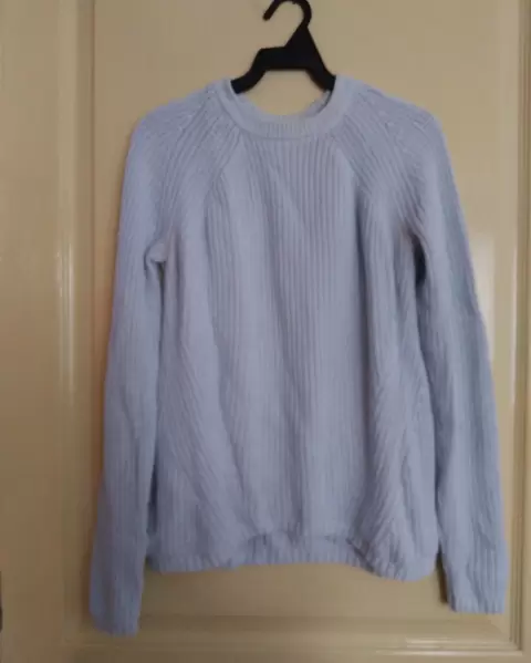 Suéter Mango color Baby Blue, viene un poco amplia para ser XS, por lo que si eres S o M, te queda Perfecto. Sin jalones o bolitas.