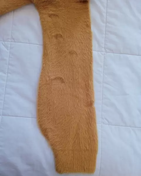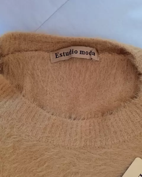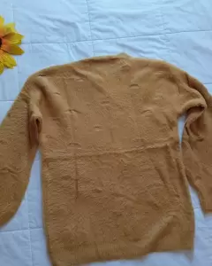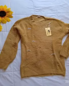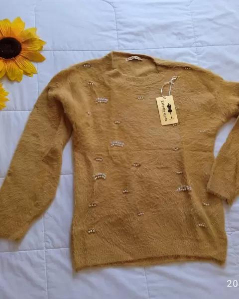 Suéter Mostaza. Tela de peluche con licra es talla unitalla color mostaza con perlas enfrente y figuras en todo