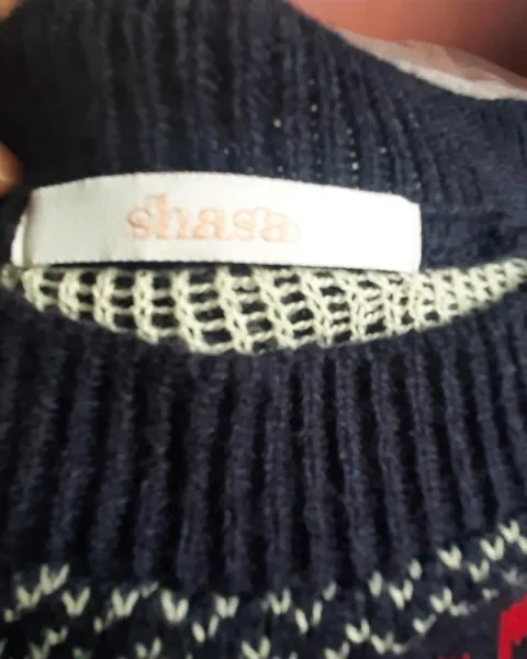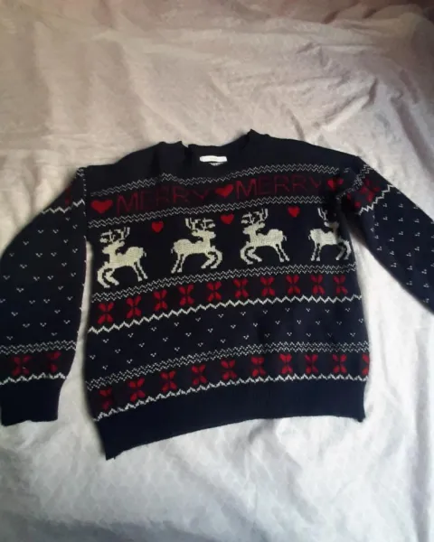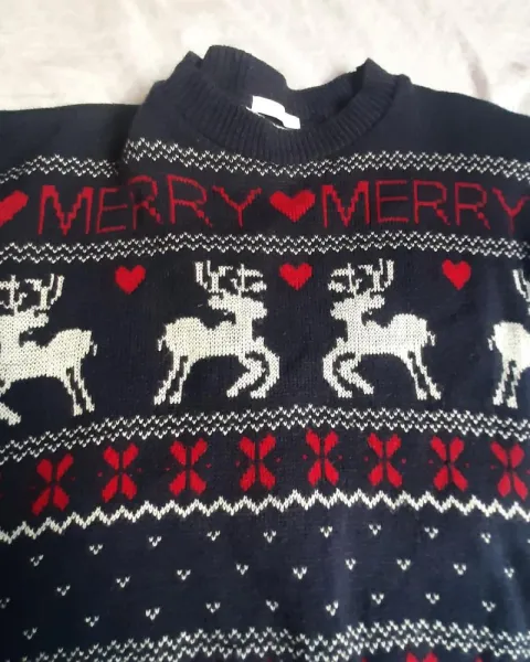 Sueter navideño, color azul marino, con grabado de reno, talla ch.Solo tiene una puesta