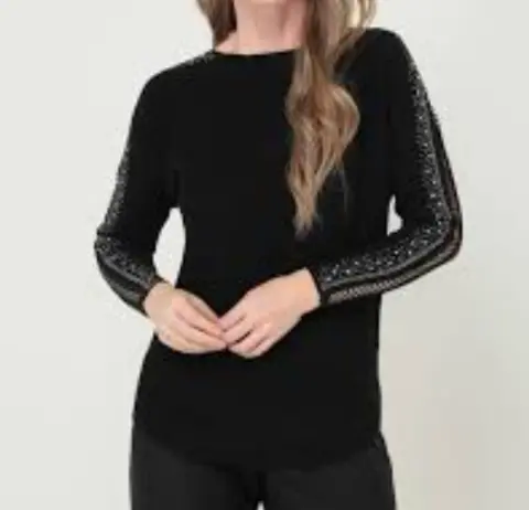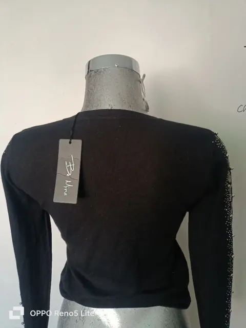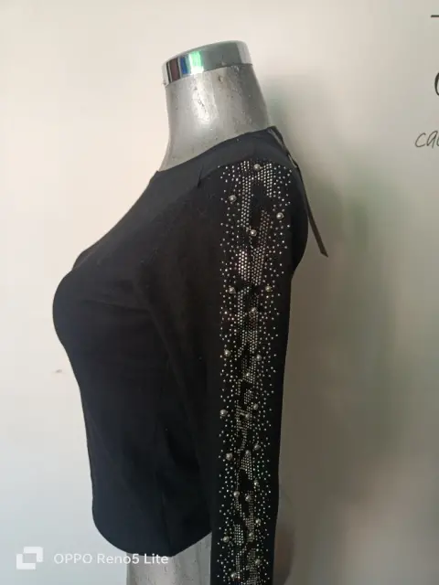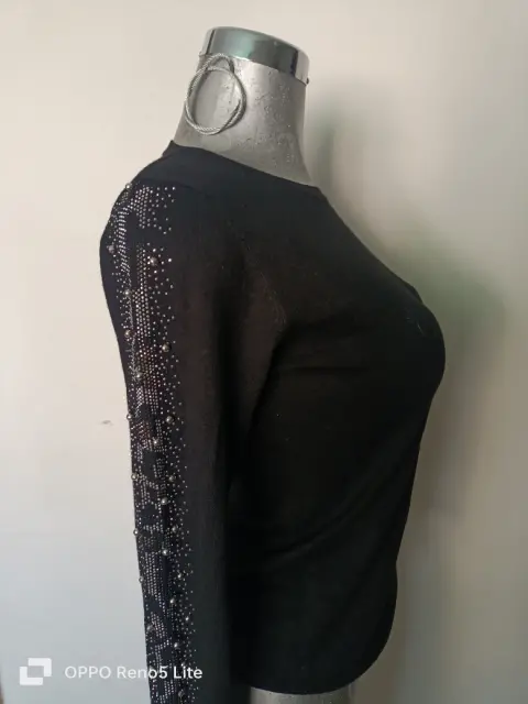 Hermoso suéter negro Detalles de brillos en los costadosTalla G, pero queda bien desde m.Nuevo y super suave