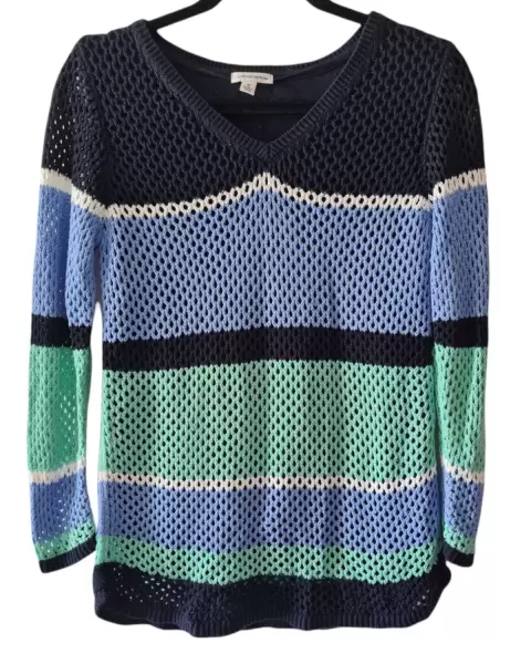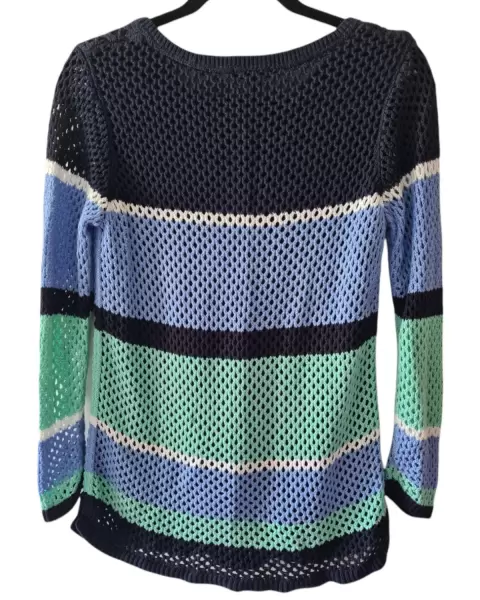 Sueter rayas horizontales. Sueter cuello V, tejido perforado,con forro que hace que no transparente, excepto las mangas esa parte no tiene forro.
