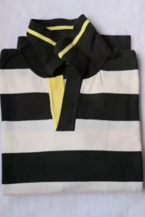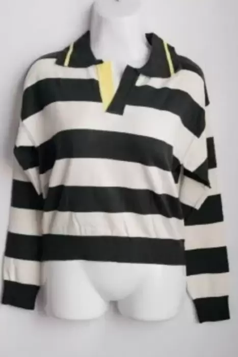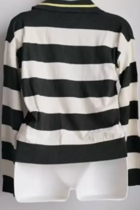 Suave suéter retro tipo polo color con patrón de rayas verdes y detalles de líneas amarillas, hombros caídos. Viscosa con elástico ligero que permite ajustar a tu figura. NUEVO sin etiqueta.Medidas:Axila a axila: 47 cmLargo: 50 cmHombro: 47 cm