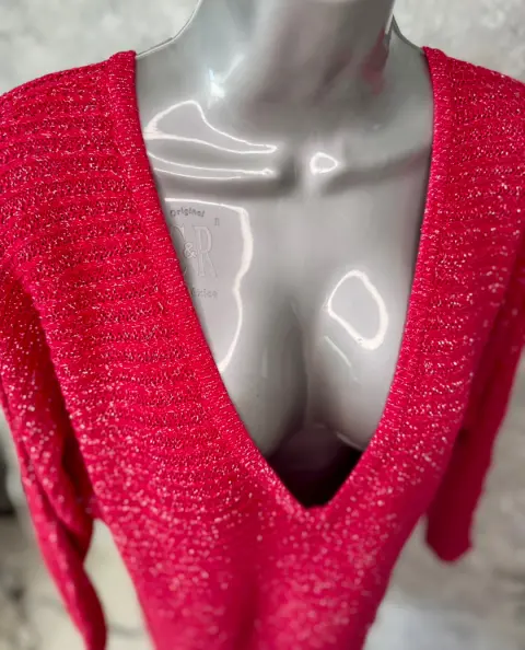 Suéter rojo de punto largo estilo camisero con escote pronunciado talla L, tiene mangas de murciélago no muy marcadas.Tiene ligeros brillos que la hacen lucir elegante.Medidas; de axila a axila 52, de hombro a axila, 31 cm, largo 87 cm y escote 22 cm