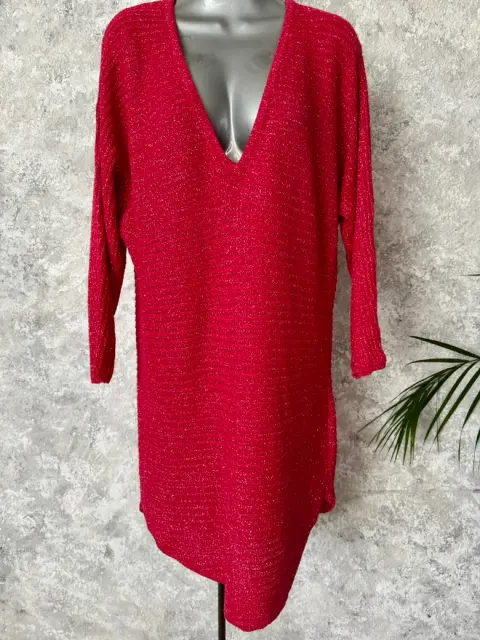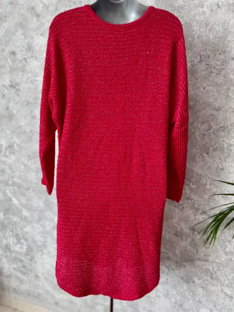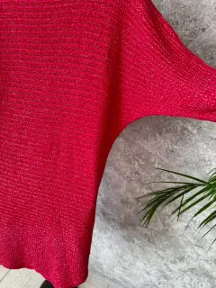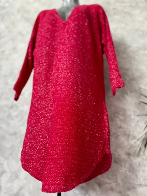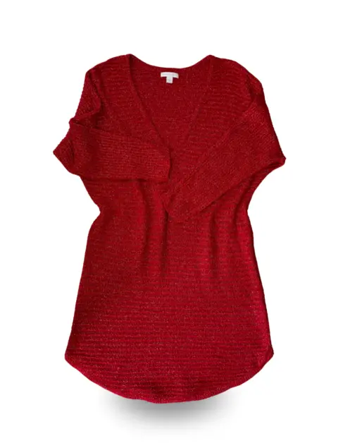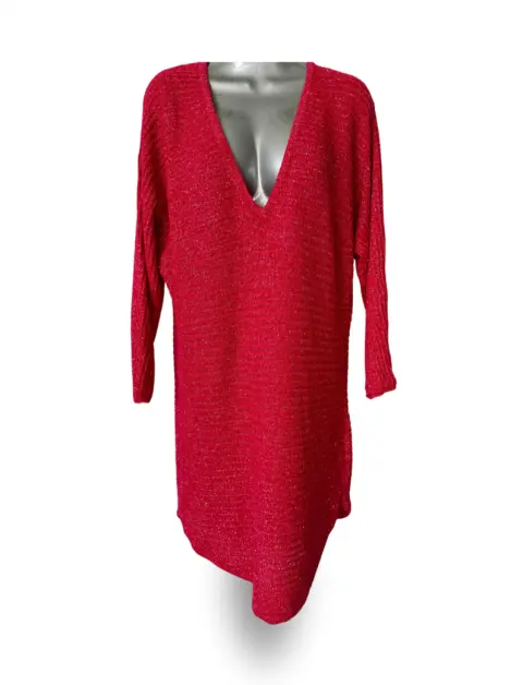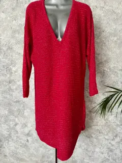 Suéter rojo de punto, largo camisero L. Suéter rojo de punto largo estilo camisero con escote pronunciado talla L, tiene mangas de murciélago no muy marcadas.Tiene ligeros brillos que la hacen lucir elegante.Medidas; de axila a axila 52, de hombro a axila, 31 cm, largo 87 cm y escote 22 cm