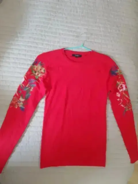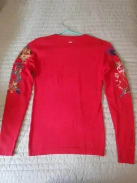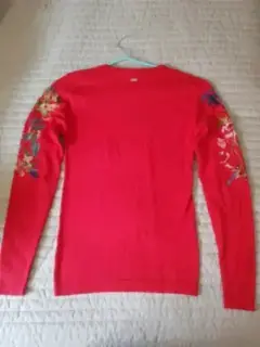 Suéter rojo talla S. Precioso Suéter con estampados bordados en los brazos, sin ningún detalle Talla S 62 cm largo de hombro a puño, ancho de cuello 15 cm, largo 60 cm, solo 1 puesta