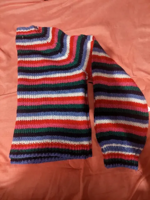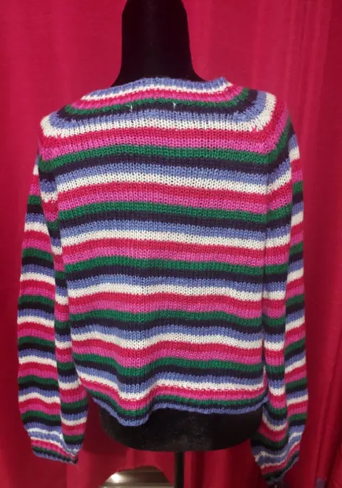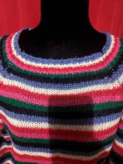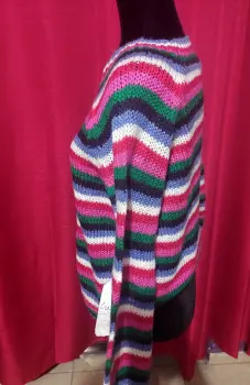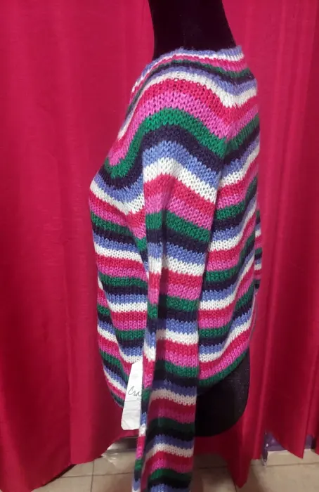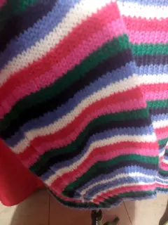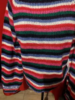 Sueter tejido de colores. Sueter colorido, corto talla L, con u diseño de manga bombacha, hermoso. Medida de axila a axila 112 todo el contorno y de hombro a cintura 54.5.