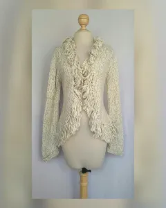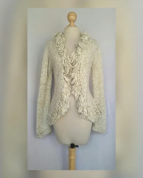 Suéter en tejido de punto tono CRUDO JASPEADO, cuello pico, cierre p/ganchillo, flecos en zonas cuello, frontal y baja. Talla XL (REDUCIDA, da mejor a L). Dimensiones cms: 38 hombro, 47 axila, 44 cintura, 56 zona baja, 61 largo, 75 largo manga. 100% acrílico. P/lavado en casa.***NUEVO, SE LE CAYO LA ETIQUETA ESTANDO GUARDADO***