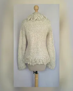 Suéter Tejido de Punto Flecos. Suéter en tejido de punto tono CRUDO JASPEADO, cuello pico, cierre p/ganchillo, flecos en zonas cuello, frontal y baja. Talla XL (REDUCIDA, da mejor a L). Dimensiones cms: 38 hombro, 47 axila, 44 cintura, 56 zona baja, 61 largo, 75 largo manga. 100% acrílico. P/lavado en casa.***NUEVO, SE LE CAYO LA ETIQUETA ESTANDO GUARDADO***