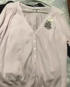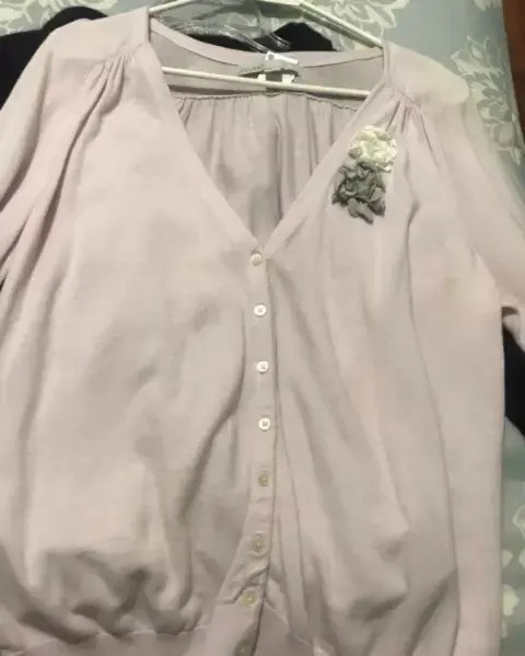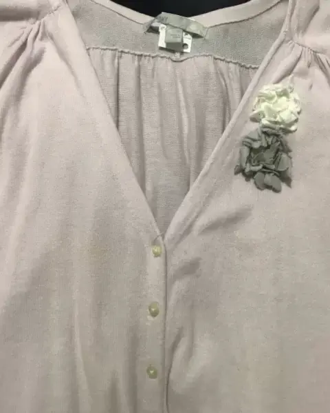 Suéter lila, Old Navy, talla L, usado, sin detalles, con adorno y abotonado al frente.