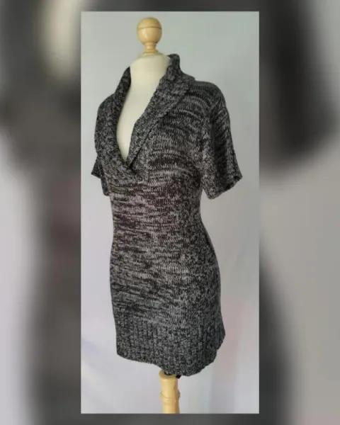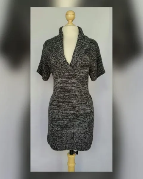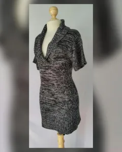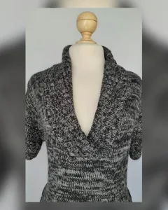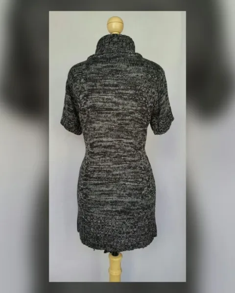 Suéter en tejido de punto estilo túnica en tonos NEGRO/GRIS PIZARRA MARMOLEADO, cuello collar, manga corta y trabillas en cintura p/ajustarle un cinturón (NO INCLUIDO). Talla G. Dimensiones cms: 45 hombro, 51 axila, 46 cintura, 55 zona baja, 79 largo, 20 largo manga. 100% acrílico. Para lavado en casa.