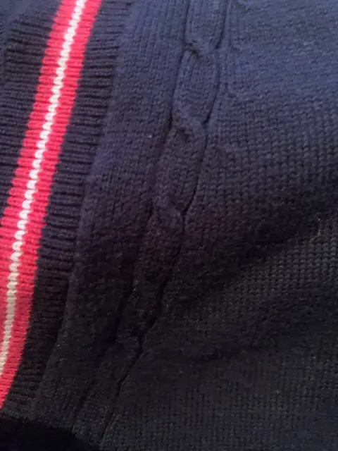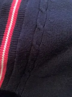 Suéter TOMMY HILFIGER azul marino con vivos rojos en cuello , vivos verdes en mangas, manga 3/4, con botones al frente