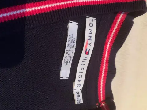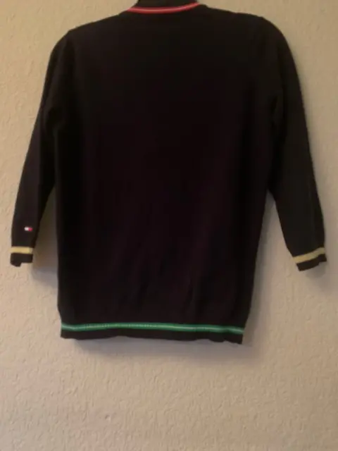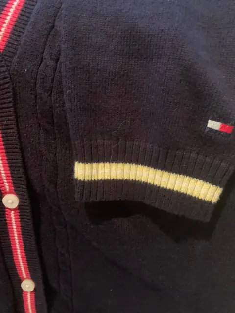 Suéter TOMMY azul marino. Suéter TOMMY HILFIGER azul marino con vivos rojos en cuello , vivos verdes en mangas, manga 3/4, con botones al frente