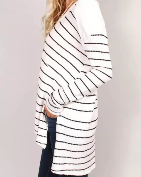 Suéter túnica en tejido waffle. Térmico.Es color crudo con rayas negras. El estilo es holgado pero puede quedar a L Super cómodo.Nuevo