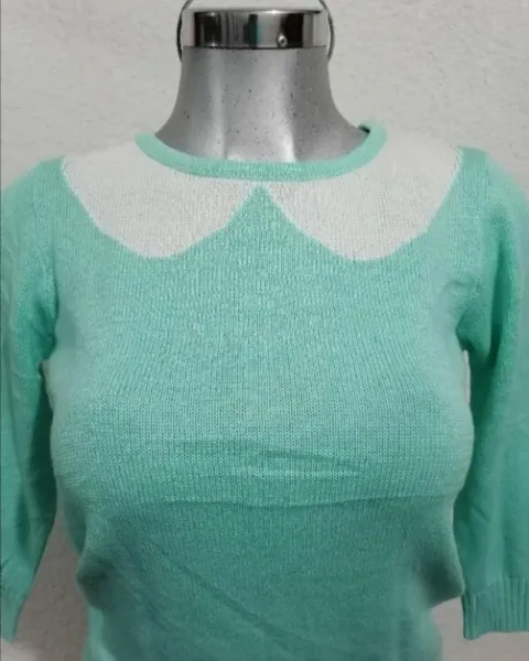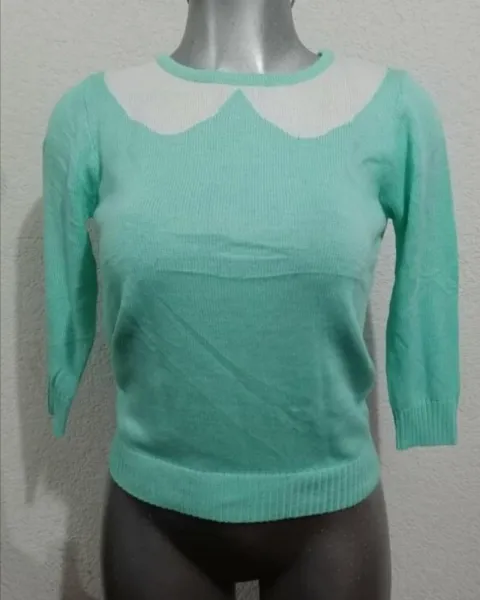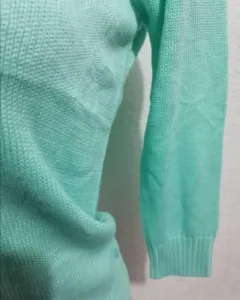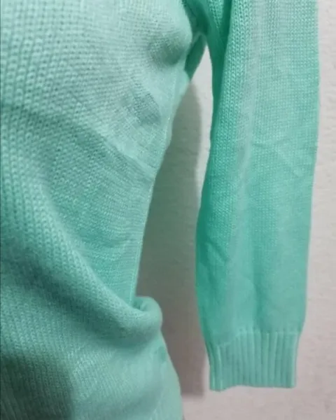 Suéter verde con manga 3/4. Hermosa blusita hombros descubiertos gris jaspeada, manga larga, tela agradable al tacto y a la piel, semicalientita. 64% rayon, 30%poliester, 6% elastano.Medidas largo 50 cm, axila a axila 37cm, laego manga 55cm