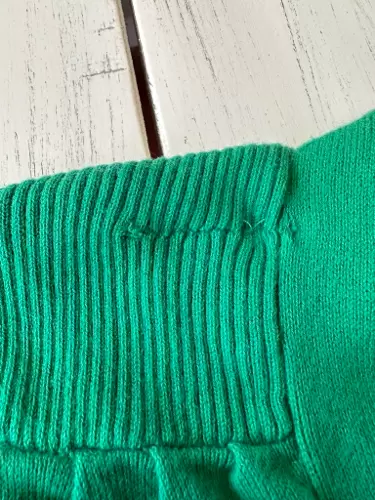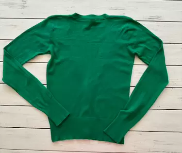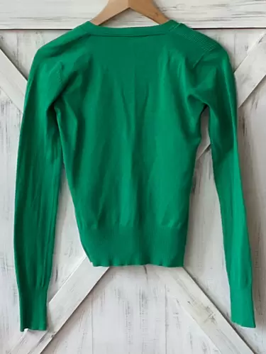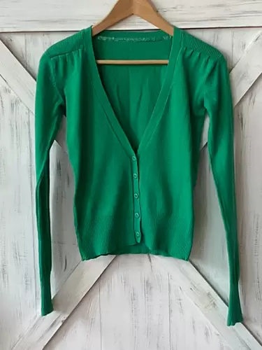 Suéter verde ligero botones al frente. El color no es tan fuerte como en las fotos, tiene una mancha y tiene un remiendo. Se ve en fotos.Talla: XXS o XSMedidas: 35 cm de hombros, 40 cm de axila y 54 cm de largo.